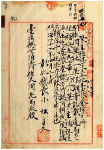 七 彰化庁長小松吉久ノ稟申ニ依リ彰化庁管内ニ於ケル黄尾[外一名]ヘ馬芝堡福興庄・黄亮董ヘ馬芝堡草港尾庄・辜玉成[外七名]ヘ馬芝堡鹿港街土名菜市頭・葉増輝ヘ馬芝堡頂厝庄土名崙仔頂・陳海ヘ線西堡塗厝厝庄土名嘉宝潭・洪塗水ヘ線西堡塗厝厝庄土名塗厝厝・楊江水ヘ線東堡渡船頭庄土名渡船頭・趙欽ヘ線東堡阿夷庄土名宝謙・林光輝[外二名]ヘ猫羅堡田中央庄・陳高低卿[外二名]ヘ武東堡内湾庄・陳浩ヘ東螺西堡渓茄厝庄ノ開墾地業主権認定方認可ノ件(指令第四二三六号)