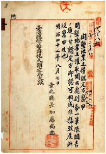 八 台北庁長加藤尚志ノ稟申ニ依リ台北庁管内ニ於ケル曹烟[外三三名]ヘ芝蘭一堡永福庄土名荘仔頂・劉査某[外四名]ヘ芝蘭一堡永福庄土名荘仔頂・劉査某[外四名]ヘ芝蘭一堡永福庄土名抜仔埔・劉査某[外四名]ヘ芝蘭一堡永福庄土名荘仔頂・呉鹿瑞[外二名]ヘ芝蘭一堡永福庄土名荘仔頂・劉仁育ヘ芝蘭一堡永福庄土名抜仔埔・劉乾生[外八名]ヘ芝蘭一堡永福庄土名荘仔頂・曹烏定[外一六名]ヘ芝蘭一堡永福庄土名抜仔埔・張究耳ヘ芝蘭一堡永福庄土名荘仔頂・魏如林[外三名]ヘ芝蘭一堡永福庄土名抜仔埔・劉阿蒲[外二名]ヘ芝蘭一堡永福庄土名荘