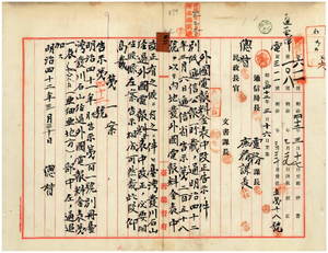 二二 明治四二年三月六日逓信省告示第二五八号ヲ以テ内地発外国電報料金表中改正ニ伴ヒ明治四一年九月告示第一〇一号別冊台湾発川石山経過外国電報料金表第一表亜細亜地方ノ部中追加ノ件(告示第四二号)