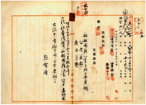 九 台北庁大加蚋堡大稲花港辺街辜顕栄所有ノ汽船台湾府号カ清国福州府沿岸ニテ沈没シ船舶国籍証書喪失ニ付キ同台湾府号ノ船舶国籍証書無効ノ旨公告並ニ広告ノ件