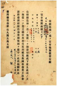 四 謝賞・謝雪・謝玉・謝大瑞・謝勅・謝鉢・謝存心・鄭粉・謝糧・謝義・謝興秩・謝于・謝鉄・謝轟・謝禎・謝庇・謝栄・謝経・謝軟・謝根・謝哈・謝取・郭漏・謝英・謝水壺・劉氏車・梁悔・梁貯・梁鉄国・謝居ヘ樟樹造林ノ為メ鳳山庁小竹下里赤崁庄・鳳山上里大坪頂庄土名大坪頂山ノ官有地無償貸付ノ件(指令第三三六八号)(1908-04-01~1908-09-20);謝集ヘ樟樹造林ノ為メ官有地無償貸付許可地名義変更ノ件(指令第三六一四号)(1909-07-05~1909-09-01)