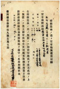 一九 下崁庄植林組合長葉葆華ヘ樟樹造林ノ為メ斗六庁沙連堡下崁庄土名和渓厝ノ官有地無償貸付ノ件(指令第四四九九号)