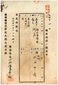 九 台湾総督府民政部殖産局長代理福留喜之助ノ具申ニ依リ台湾総督府技師山田申吾ニ殖産事務取調ノ為メ東京・大阪・神奈川県ヘ出張ヲ命ス