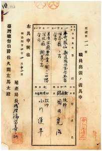 四一 台湾総督府民政部殖産局長代理福留喜之助ノ具申ニ依リ台湾総督府技師岡田寛治ニ獣疫予防事務監督ノ為メ斗六・鳳山・恒春各庁管内ヘ出張ヲ命シ、台湾総督府技師小川運平ニ農業ニ関スル旧慣調査ノ為メ基隆・宜蘭・深坑各庁管内ヘ出張ヲ命ス