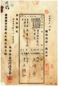 四六 台湾総督府民政部殖産局長代理福留喜之助ノ具申ニ依リ台湾総督府技師長崎常ニ害虫駆除予防監督ノ為メ台北・深坑・桃園・新竹・苗栗・台中・南投・彰化・斗六・嘉義・塩水港・台南・阿緱・凰山・蕃薯リョ各庁管内ヘ出張ヲ命シ、台湾総督府技師素木得一ニ天蚕飼育調査ノ為メ台中・南投両庁管内へ出張ヲ命ス