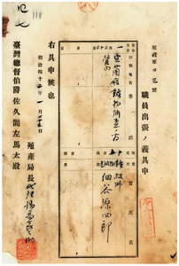 四七 台湾総督府民政部殖産局長代理福留喜之助ノ具申ニ依リ台湾総督府技師細谷源四郎ニ鉱物調査ノ為メ宜蘭庁管内ヘ出張ヲ命ス
