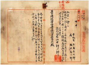 二四 台湾総督府民政部総務局長山田新一郎ヨリ台湾総督府事務官手島兵次郎ト台湾総督府属塩田為次郎ニ法務ニ関スル用務ノ為メ上京ヲ命セラレ度キ旨内申ノ件[上欄外に「府報掲載禁止」とあり]