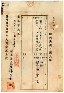 三三 台湾総督府民政部殖産局長代理福留喜之助ノ具申ニ依リ技師賀田直治ニ開墾及ヒ移民ニ関スル旧慣調査ノ為メ彰化庁管内ヘ出張ヲ命ス