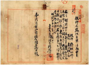 三五 台湾総督府民政部土木局長代理高橋辰次郎ヨリ東京出張中ノ台湾総督府技師野村一郎ト台湾総督府嘱託森山松之助ヘ愛知県名古屋市ニテ開催サレル共進会ニ関スル用務ノ為メ名古屋ヘ出張ヲ命セラレ度キ旨内申ノ件