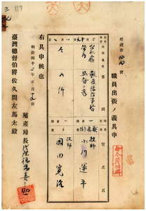 三七 台湾総督府民政部殖産局長代理福留喜之助ノ具申ニ依リ台湾総督府技師ノ小川運平ト岡田寛治ニ獣疫予防事務監督ノ為メ台北庁管内ヘ出張ヲ命ス