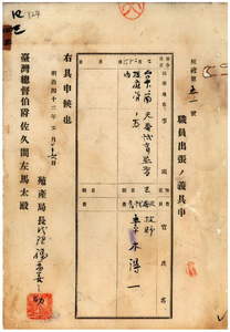 四三 台湾総督府民政部殖産局長代理福留喜之助ノ具申ニ依リ台湾総督府農事試験場技師素木得一ニ天蚕試育監督ノ為メ台中ト南投両庁管内ヘ出張ヲ命ス