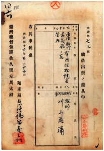 四六 台湾総督府民政部殖産局長代理福留喜之助ノ具申ニ依リ台湾総督府技師川上瀧弥ニ有用植物調査ノ為メ基隆・新竹・嘉義各庁管内ヘ出張ヲ命ス