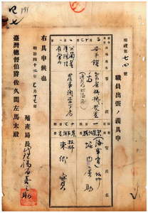 四七 台湾総督府民政部殖産局長代理福留喜之助ノ具申ニ依リ台湾総督府技師堀内広助ニ製茶機械検査ノ為メ安平鎮ヘ出張ヲ命シ台湾総督府技師東郷実ニ農事調査ノ為メ宜蘭・基隆・深坑各庁管内ヘ出張ヲ命ス