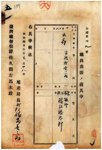 五一 台湾総督府民政部殖産局長代理福留喜之助ノ具申ニ依リ台湾総督府技師藤江勝太郎ニ事務打合ノ為メ出府ヲ命ス