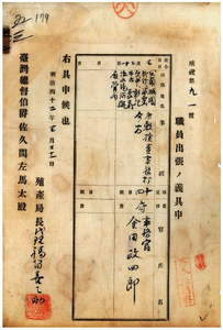 五三 台湾総督府殖産局長代理福留喜之助ノ具申ニ依リ台湾総督府事務官金田政四郎ニ米穀検査事務打合ノ為メ宜蘭・桃園・新竹・苗栗・台中・彰化・斗六・嘉義・塩水港・阿緱各庁管内ヘ出張ヲ命ス