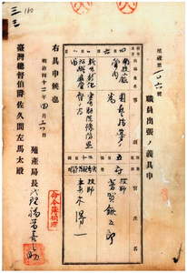 三三 台湾総督府民政部殖産局長代理福留喜之助ノ具申ニ依リ台湾総督府技師芳賀鍬五郎ニ園芸指導ノ為メ南投庁管内ヘ出張並ニ同技師素木得一ニ害虫駆除予防監督ノ為メ新竹・彰化・阿緱ノ各庁管内ヘ出張ノ件[四二も見よ]
