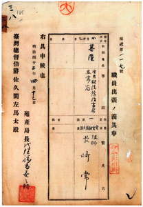 三八 台湾総督府民政部殖産局長代理福留喜之助ノ具申ニ依リ台湾総督府技師長崎常ニ害虫駆除予防事務監督ノ為メ基隆ヘ出張ノ件