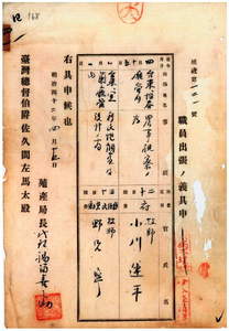 四一 台湾総督府民政部殖産局長代理福留喜之助ノ具申ニ依リ台湾総督府技師小川運平ニ農事視察ノ為メ台東庁ト恒春庁両管内ヘ出張並ニ台湾総督府技師野呂寧ニ移民地調査及ヒ設計ノ為メ台東ト宜蘭両庁ヘ出張ノ件