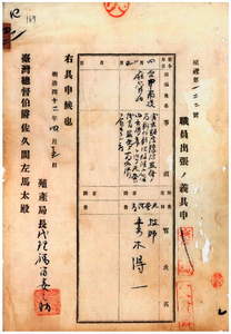 四二 台湾総督府民政部殖産局長代理福留喜之助ノ具申ニ依リ台湾総督府技師素木得一ヘ害虫駆除予防ノ為メニ新竹・彰化・阿緱ノ各庁ヘ出張ノ序ヲ以テ、天蚕試育監督ノ為メ出張ノ件[三三も見よ]
