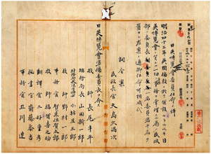 一三 日英博覧会ニ関スル準備事務ノ掌理ノ為メ台湾総督府民政長官大島久満次ニ日英博覧会準備委員長ヲ、台湾総督府技師長尾半平・台湾総督府民政部総務局長山田新一郎・台湾総督府民政部財務局長法学博士小林丑三郎・台湾総督府技師野村一郎・台湾総督府事務官賀来佐賀太郎・台湾総督府技師福留喜之助・台湾総督府翻訳官三好重彦・台湾総督府秘書官斎藤参吉・台湾総督府事務官立川連ニ日英博覧会準備委員ヲ命ス[「禁府報掲載」と記載]
