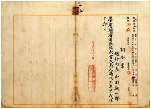 一五 台湾総督府民政部総務局長山田新一郎ニ台湾総督府民政長官大島久満次不在中ノ代理ヲ命ス