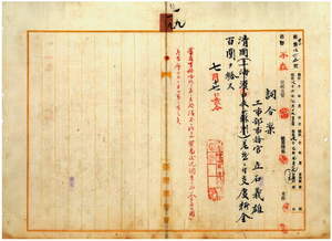 一九 台湾総督府民政部財務局長小林丑三郎ノ内申ニ依リ臨時台湾工事部事務官立石義雄ニ清国出張ニ付キ支度料百円ヲ給ス[五を見よ]