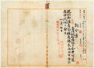 一〇 台湾総督府民政部殖産局長代理福留喜之助ノ具申ニ依リ台湾総督府技手今井可叟ヲ民政部殖産局権度課長山田申吾不在中ノ代理ヲ命ス