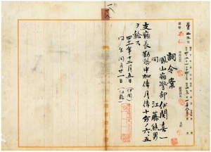 一八 鳳山庁長横山虎次ノ上申ニ依リ鳳山庁警部ノ伊関喜一(明治四一年一二月五日付)ト江藤熊男(明治四一年一二月二一日付)ニ支庁長勤務中加俸月俸十分ノ六・五ヲ給ス