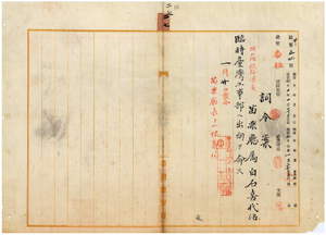 二七 臨時台湾工事部長大島久満次ノ内申ニ依リ苗栗庁税務課長苗栗庁属白石嘉代治ニ臨時台湾工事部ヘ出向ヲ命シ(一月二〇日発令)次テ臨時台湾工事部書記ニ任シ総務課勤務ヲ命スル件(一月三一日付)及ヒ苗栗庁長家永泰吉郎ヨリ白石書記ノ辞令発令日付ニ関スル照会並ニ同庁長ヘ通知ノ件