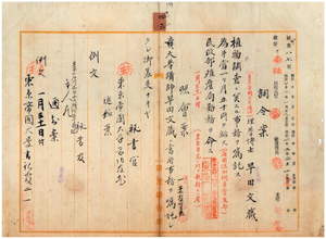 四三 台湾総督府民政部殖産局長代理福留喜之助ノ具申ニ依リ東京帝国大学講師早田文蔵ニ本島ノ有用植物ノ調査ニ関スル事務ヲ嘱託シ民政部殖産局勤務ヲ命ス但シ本島ニハ完全ナル設備ナキ為メ東京小石川区白山御殿町ノ自宅ニ於テ執務スルモノトス