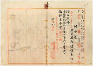五 宜蘭庁属猪俣吉次ハ疾病ニ罹リ職ニ堪ヘサル旨ヲ以テ辞職願ニ依リ昇級ノ上事務格別勉励ニ付キ一時金ヲ賞与シ本官ヲ免ス
