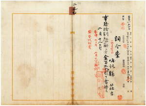 二九 台湾総督府民政部殖産局長代理福留喜之助ノ具中ニ依リ二月一八日付解嘱予定ノ殖産局嘱託県荘吉ニ事務格別勉励ニ付キ一時金ヲ賞与ス