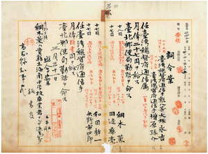 三六 台北郵便局長伊藤金弥ノ上申ニ依リ台湾総督府通信手大塚永吉ト増原孫介ヲ台湾総督府通信属ニ任シ台北郵便局勤務ヲ命シ、台北郵便局ノ通信事務員細木薫・通信助手田辺彝亮・通信事務員兼通信助手和田静一・通信助手矢野市四郎ヲ台湾総督府通信手ニ任シ台北郵便局勤務ヲ命ス