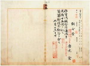 三九 苗栗郵便局長杉本初吉ノ内申ニ依リ苗栗郵便局勤務通信事務員岩元登ヲ台湾総督府通信手ニ任シ苗栗郵便局勤務ヲ命ス