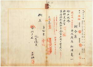 六八 南投庁属松浦亀一ハ麻拉里亜ニ罹リ職ニ堪ヘサル旨ヲ以テ辞職願ニ依リ昇級ノ上本官ヲ免シ事務格別勉励ニ付キ一時金ヲ賞与ス