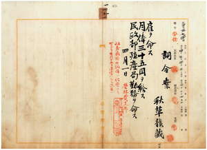 一〇一 台湾総督府民政部殖産局長代理福留喜之助ノ具申ニ依リ元恒春庁属秋草龍蔵ニ雇ヲ命シ民政部殖産局勤務ヲ命ス