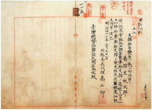 一一三 台湾総督府民政部財務局属深見牧太郎ノ俸給ハ官租改正調査費ヨリ支弁ノ処来ル四月一日ヨリ府費ヨリ支弁スルコトニ変更スル旨財務局長代理高山仰ヨリ内申ノ件
