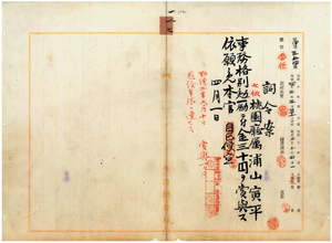 一七 桃園庁属浦山寅平ハ疾病ニ罹リ職ニ堪ヘサル旨ヲ以テ辞職願ニ依リ事務格別勉励ニ付キ一時金ヲ賞与ノ上本官ヲ免ス