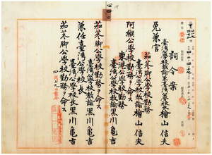 四二 阿緱庁長佐々木基ノ内申ニ依リ茄苳脚公学校勤務ノ台湾公学校教諭兼校長檜山信夫ノ兼官ヲ免シ、台湾公学校教諭黒川亀吉ヲ台湾公学校長ニ兼任シ茄苳脚公学校勤務ヲ命ス