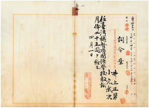 五二 台湾総督府国語学校長本荘太一郎ノ内申ニ依リ台湾総督府国語学校師範部甲科卒業生井上正男ト小穴武次ヲ台湾総督府国語学校教諭ニ任ス