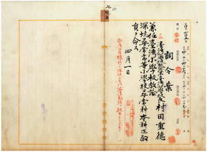 七三 深坑庁長丹野英清ノ内申ニ依リ台湾公学校教諭兼校長村田重徳ヲ台湾総督府小学校教諭ニ兼任シ深坑尋常高等小学校尋常科本科正教員ヲ命ス