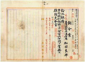 九七 台湾総督府通信属松田良平ハ麻刺利亜ニ罹リ職ニ堪ヘサル旨ヲ以テ辞職願ニ依リ昇級ノ上事務格別勉励ニ付キ一時金ヲ賞与シ本官ヲ免ス
