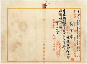一〇二 基隆内地移出米検査所勤務殖産局嘱託吉村祥二郎ハ病気ノ為メ辞職願ニ依リ嘱託ヲ解キ事務格別勉励ニ付キ一時金ヲ賞与ス