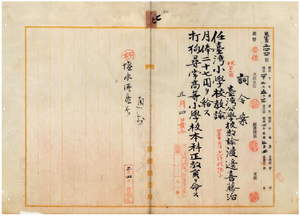 七 鳳山庁長横山虎次ト塩水港庁長朝倉菊三郎ノ内申ニ依リ塩水港公学校勤務台湾公学校教諭渡辺喜藤治ヲ台湾小学校教諭ニ任シ打狗尋常高等小学校本科正教員ヲ命ス