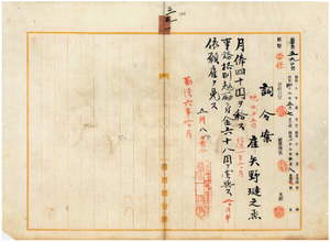 三一 台湾総督府雇矢野璉之丞ノ辞職願ニ依リ昇等ノ上事務格別勉励ニ付キ一時金ヲ賞与シ雇ヲ免ス