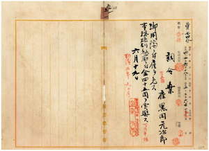 五一 台湾総督府民政部殖産局長代理福留喜之助ノ内申ニ依リ雇黒田元次郎ハ御用済ニ付キ雇ヲ免シ事務格別勉励ニ付キ一時金ヲ賞与ス