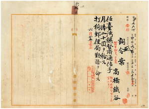六〇 打狗郵便局長永井元男ノ内申ニ依リ打狗郵便局通信事務員高橋鉄谷ヲ台湾総督府通信手ニ任シ打狗郵便局勤務ヲ命ス