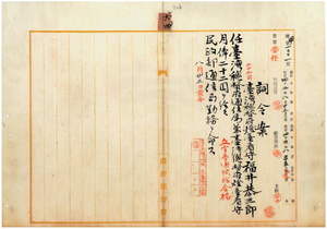 六四 台湾総督府民政部通信局長代理賀来佐賀太郎ノ内申ニ依リ台湾総督府灯台看守福井恭三郎ヲ台湾総督府通信属兼台湾総督府灯台看守ニ任シ民政部通信局勤務ヲ命ス