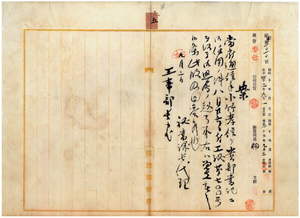 五 台北郵便局勤務台湾総督府通信手小竹孝信ヲ臨時台湾工事部書記ニ任用ノ儀ハ差支無キ旨台湾総督府総督官房秘書課長代理楠正秋ヨリ臨時台湾工事部長大島久満次ヘ回答ノ件