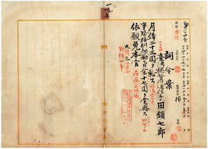 一五 台中郵便局勤務台湾総督府通信手田鎖七郎ハ慢性麻拉里亜ニ罹リ職ニ堪ヘサル旨ヲ以テ退官願ニ依リ昇給ノ上事務格別勉励ニ付キ一時金ヲ賞与シ本官ヲ免ス
